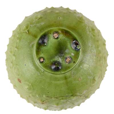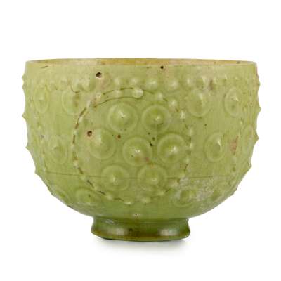 the exterior moulded with four roundels adorned with bosses, covered overall with a yellowish-green glaze, leaving three spur-marks on the base