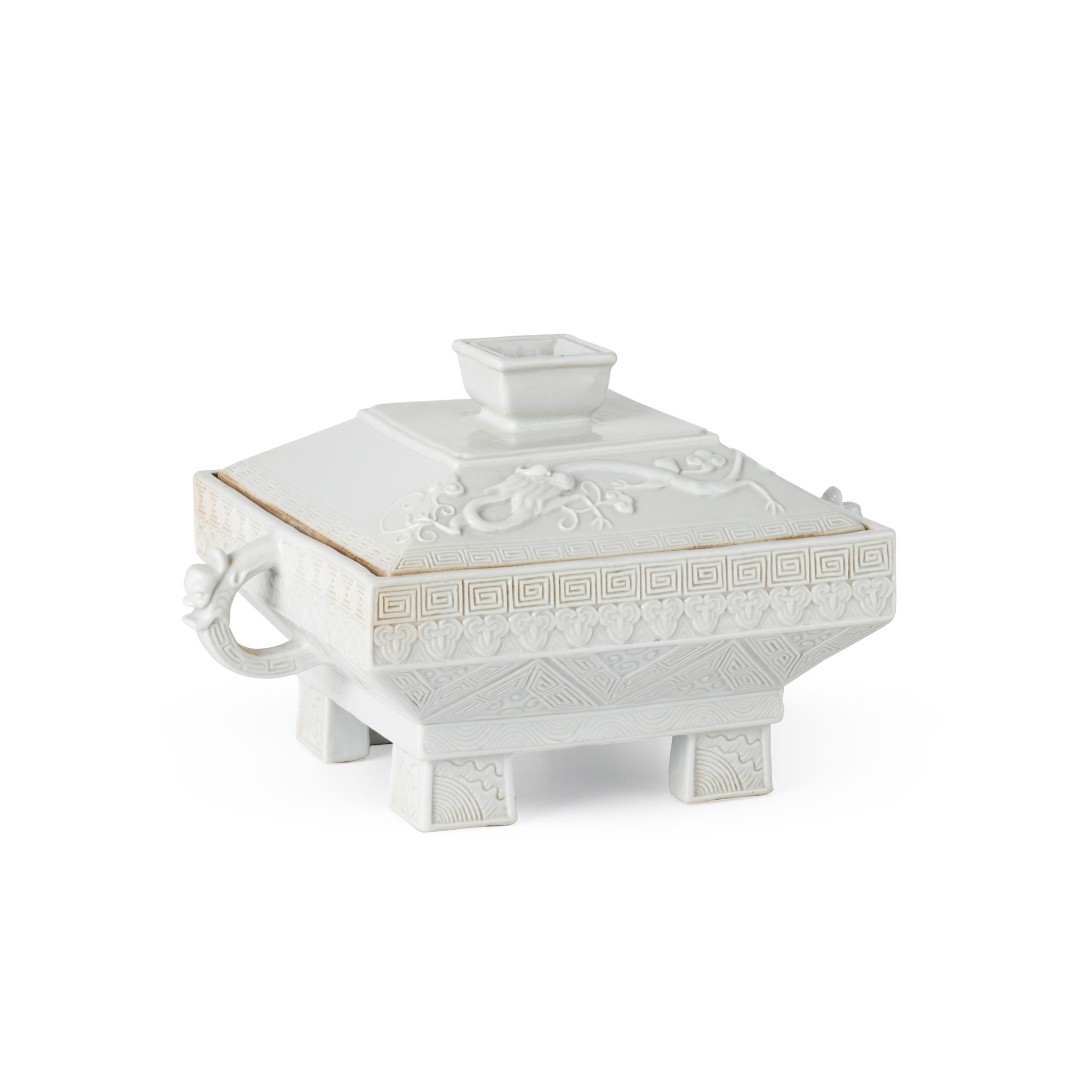 moulded in imitation of an archaic bronze ritual vessel fu, the sides with moulded triangular archaistic decoration below ruyi and key-fret bands, the sides flanked by loop handles emerging from an animal head, all supported by four bracket feet, the cover with a chilong grasping a lingzhi branch to one side and inscription to the other