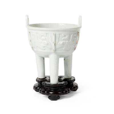 或為康熙 ‘御賜純一堂藏’底款 白釉仿古饕餮紋三足鼎式爐 帶木座