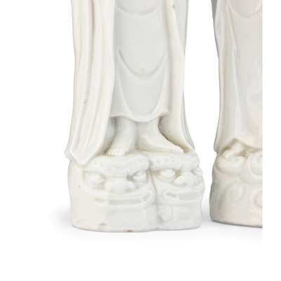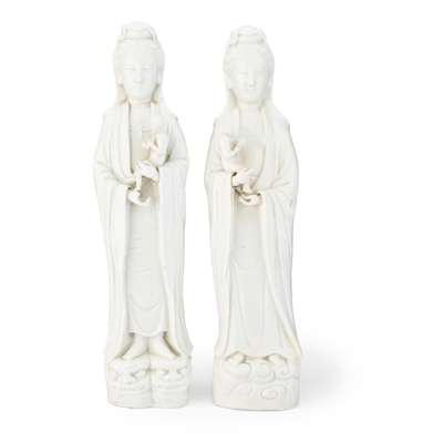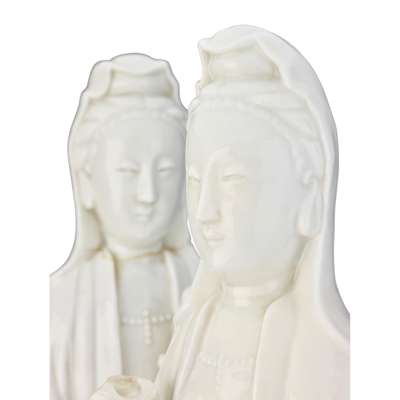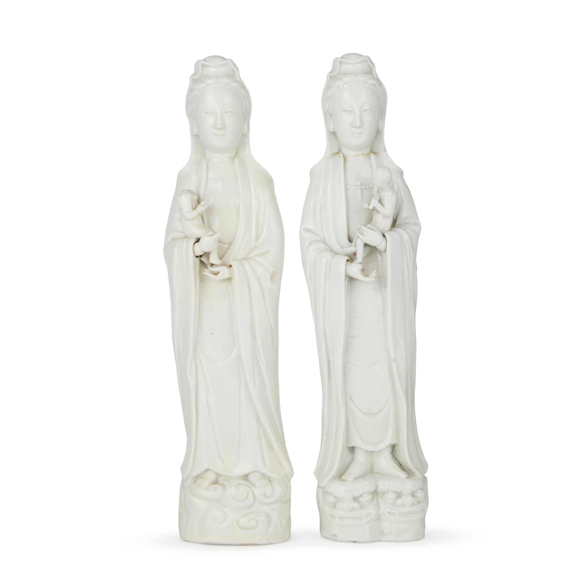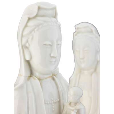 TWO CHINESE DEHUA FIGURES OF GUANYIN BESTOWING A SON