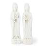 each similarly moulded in mirrored images as the gently smiling Avalokiteshvara standing upright holding a baby on her arm, she wears a long-hooded robe open at the chest to reveal beaded cross necklace, one with slightly bulging breasts standing on cloud and the other on two mythical beast heads (2)