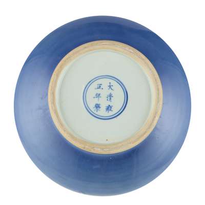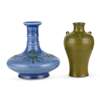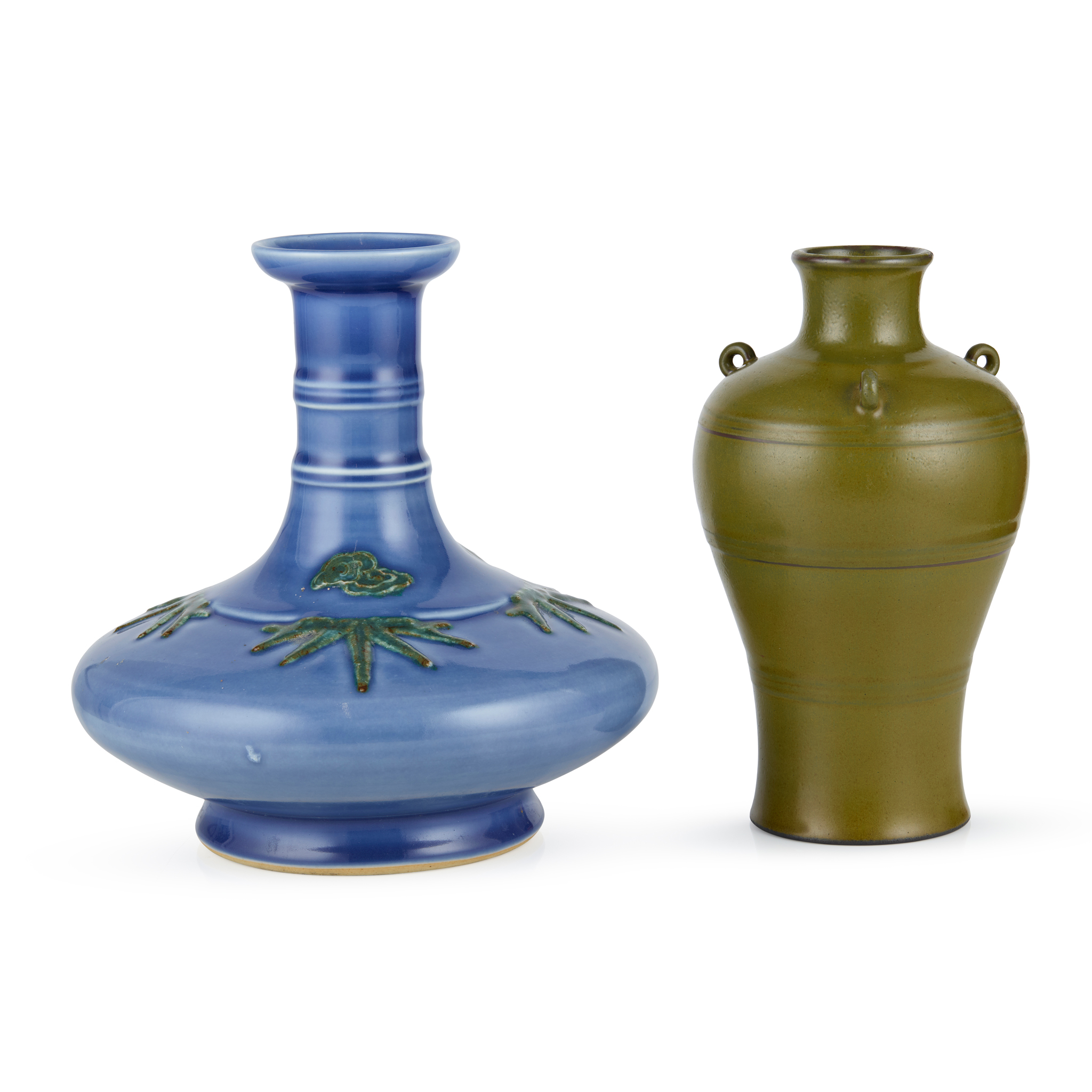 comprising: an eel-skin-glazed three-handled meiping, the base incised with a four-character Yongzheng mark; and a compressed bottle vase with moulded leaves and clouds against a blue ground, the base inscribed with a six-character Yongzheng mark within double circle in underglaze blue (2)