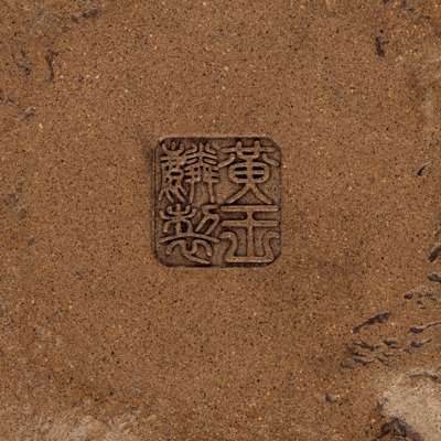 the compressed globular body moulded in imitation of a section of gnarled tree trunk, the base impressed with a four-character ‘Huang Yu Lin Zhi’ mark, the underside of the cover further impressed with ‘Huang’ and ‘Yu Lin’ marks