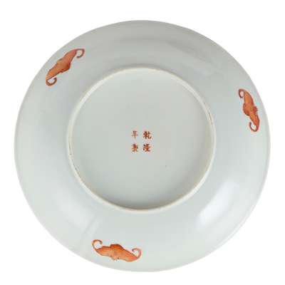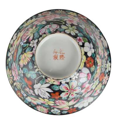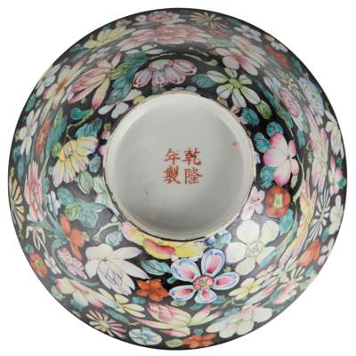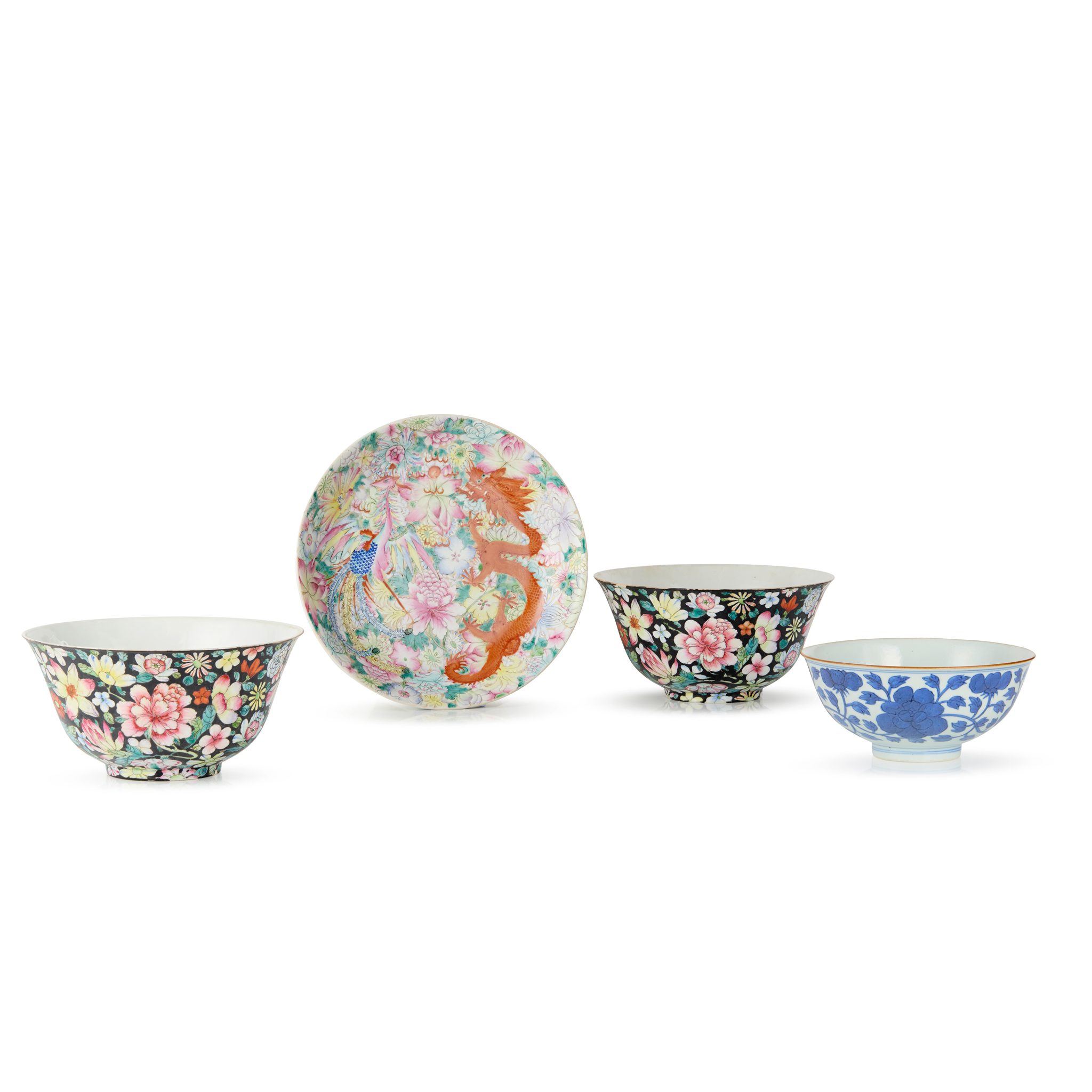 comprising: a pair of famille noire ‘millefleurs’ bowls, 20.5cm diameter each; a famille rose ‘millefleurs’ plate further decorated with dragon and phoenix, 24.6cm diameter, all three bases inscribed with a four-character Qianlong mark in iron-red; and a blue and white ‘lotus scroll’ bowl, the base inscribed with a six-character Jiaqing mark, 17.5cm diameter (4)