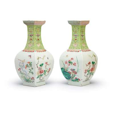 each of baluster form, painted on each panel with seasonal flowers, the neck with tendrils and qin symbols against a lime-green ground (2)