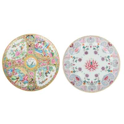 comprising: a Canton famille rose plate painted with flowers and figures; and a famille rose plate decorated with floral motif, the base inscribed with a six-character Qianlong mark in iron-red (2)