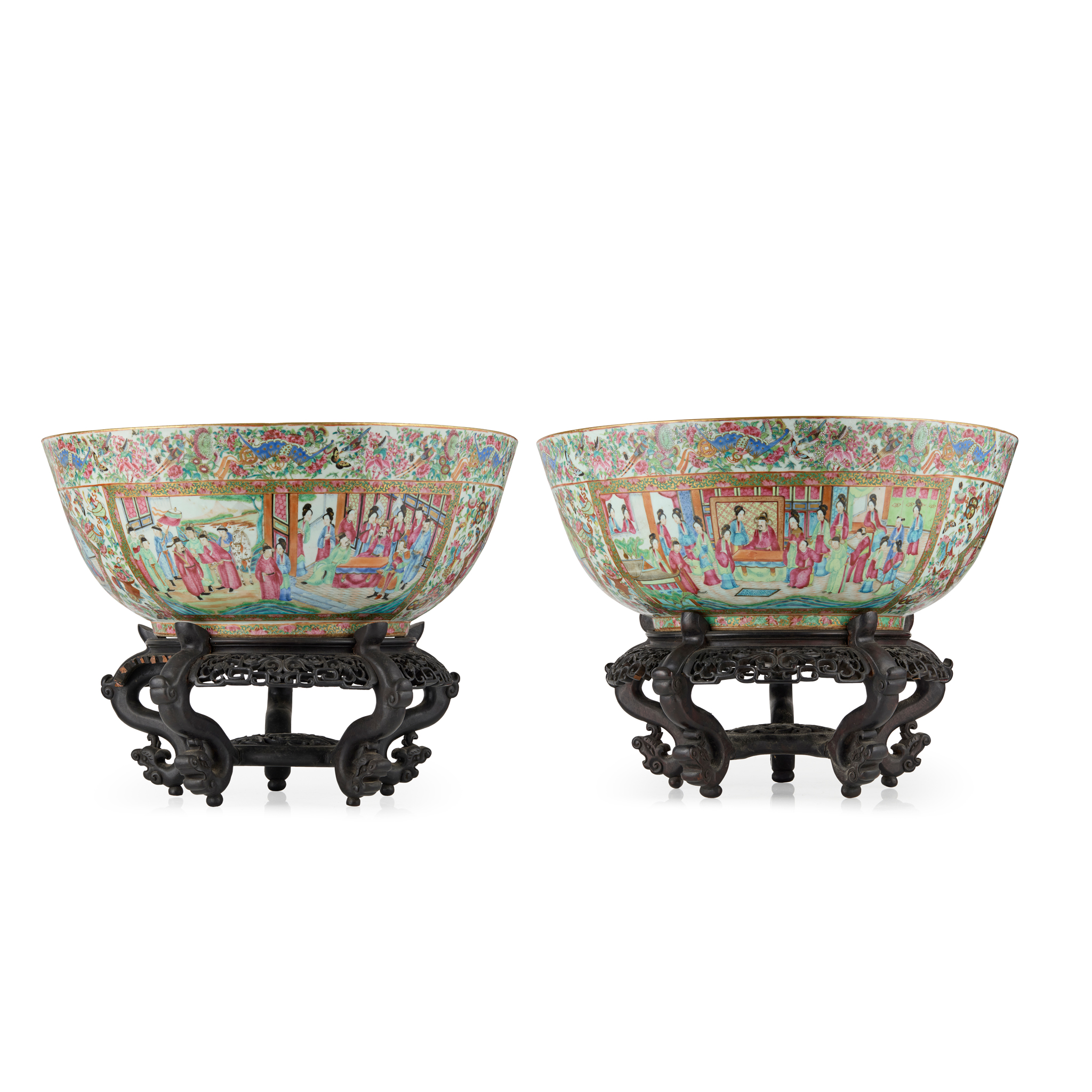 each richly enamelled in the interior with a continuous scene of immortals arriving at the garden pavilions of a palace paying tributes to a figure, the exterior with large panels of court scenes, detailed colourful borders inside and out, with two large fitted wooden stands (2)