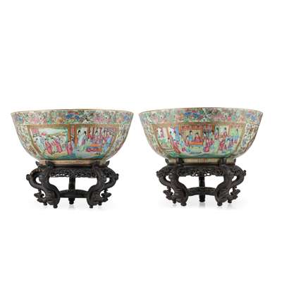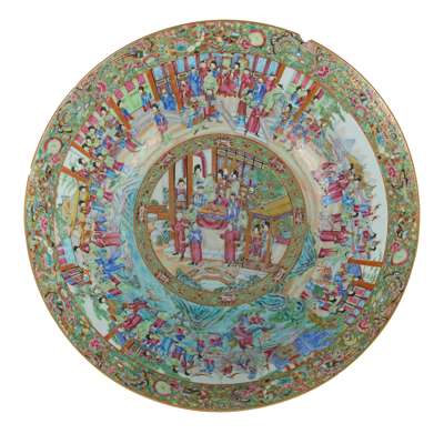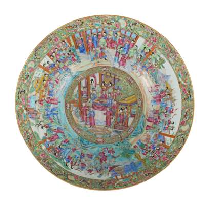 Compare to massive Canton famille rose punch bowls of similar size, sold at Christie's New York, 20 Jan 2021, lot 1; Bonhams London, 10 May 2021, lot 456; and Sotheby's London, 15 December 2022, lot 230.