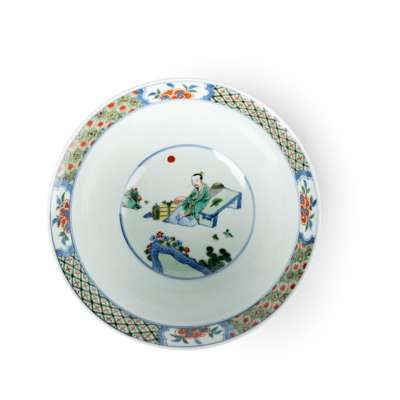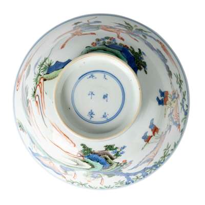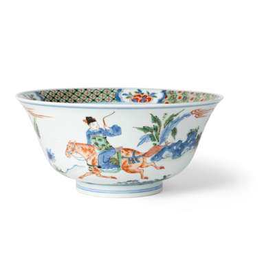 painted on the exterior with an officer riding on a horse, followed by soldiers holding flags and knives, the base of the interior painted with a scholar seated by a desk, the base inscribed with a six-character apocryphal Chenghua mark within a double-circle in underglaze blue