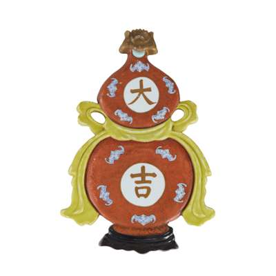 moulded as a flattened double-gourd vase tied with a yellow-enamelled ribbon at the waist, the upper and lower bulbs each centred with a circular reserve enclosing the characters 'Da' and 'Ji' (great auspiciousness)