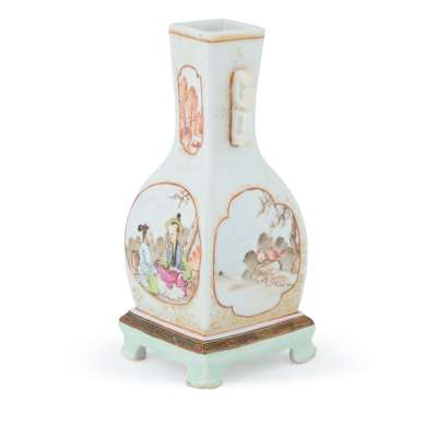 of square-section bottle form supported on an integral plinth, finely painted on both sides with ladies in cartouches alternating with birds and flowers, against a gilt-decorated tendril ground