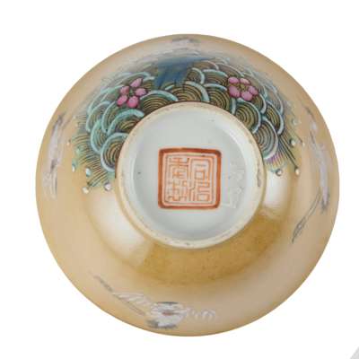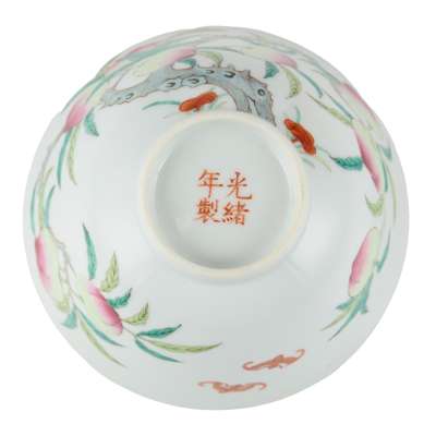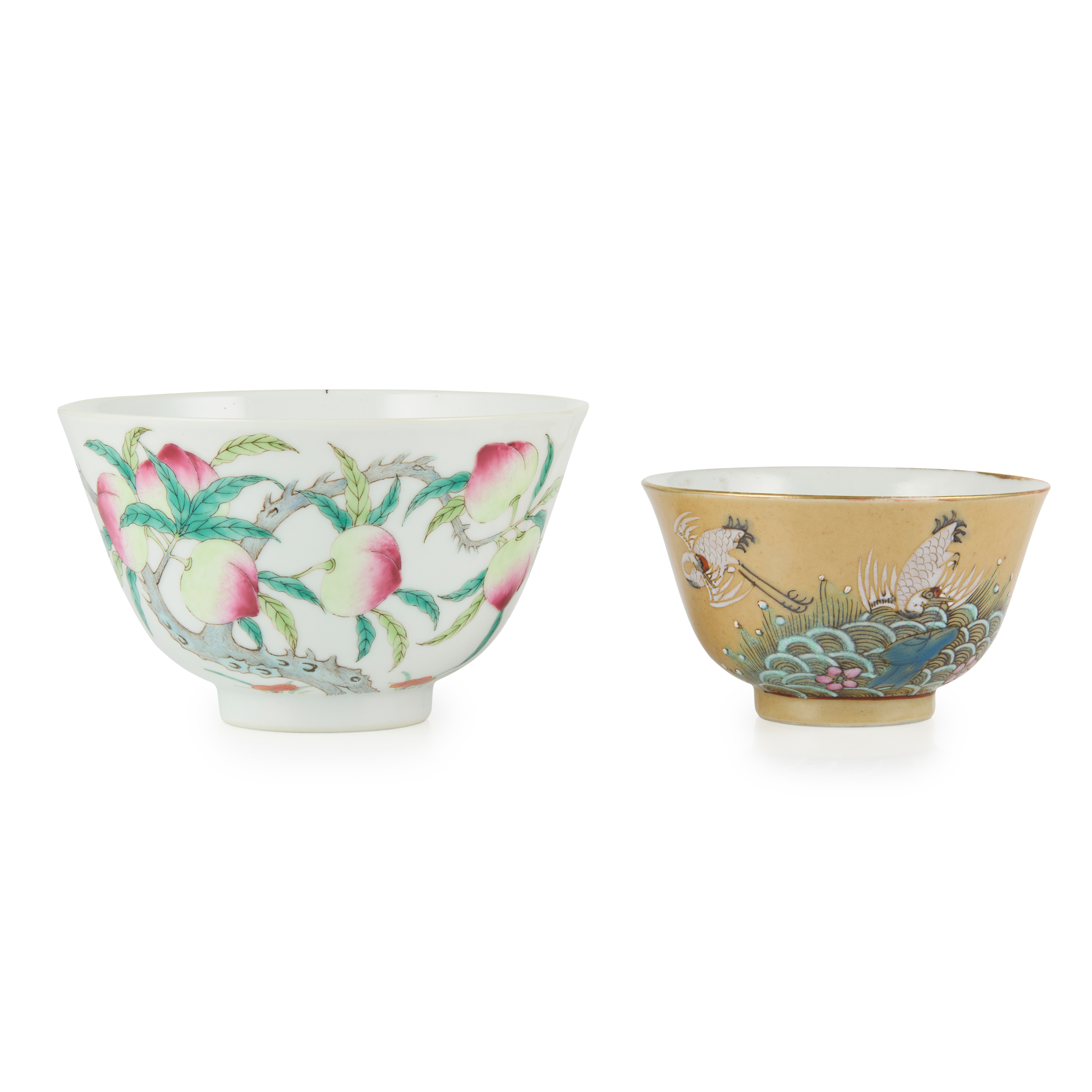 comprising: one bowl painted with nine peaches, the base inscribed with a four-character Guangxu mark; and one bowl painted with cranes with crashing waves against a cafe-au-lait ground, the base inscribed with a four-character Tongzhi mark (2)