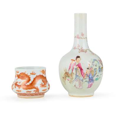 十九至二十世紀 瀚墨清香款 粉彩母子圖瓶 及 礬紅彩龍紋小香爐
