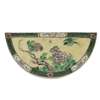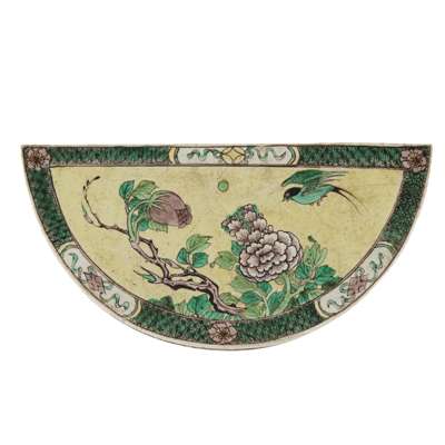of half-moon shape, the top painted with a bird in flight above blossoming peony flowers on branches, the base unglazed revealing the biscuit body