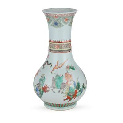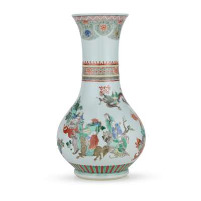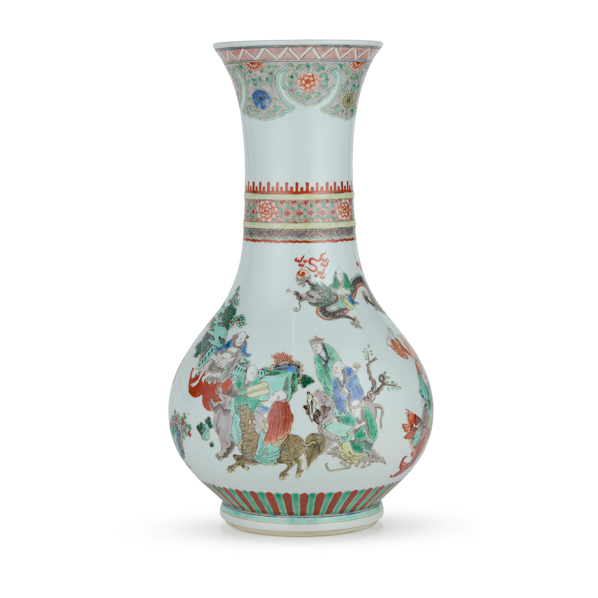 the body finely painted with various arhats with auspicious animals, the waisted neck decorated with a band of flowers within raised ribs, all under an elaborate cloud-shoulder decoration beneath the flared mouth rim