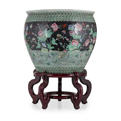 二十世紀 墨地粉彩池塘清趣圖大缸 連木座