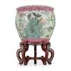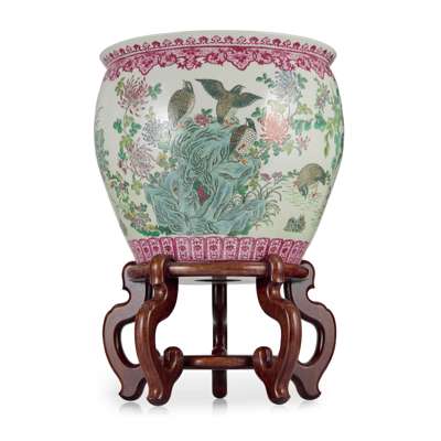 二十世紀 粉彩鵪鶉圖大缸 帶木座