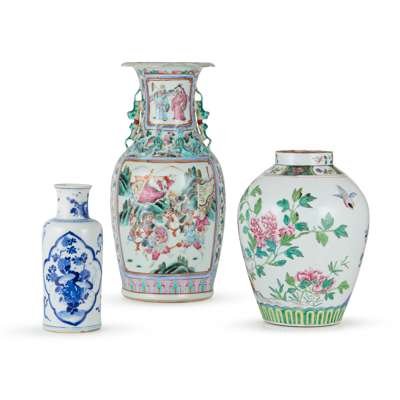 comprising: a large famille rose vase painted with warriors, 44.7cm high; a famille rose ‘phoenix’ vase, 29.6cm high; and a blue and white ‘floral’ bottle vase, 24.1cm high (3)