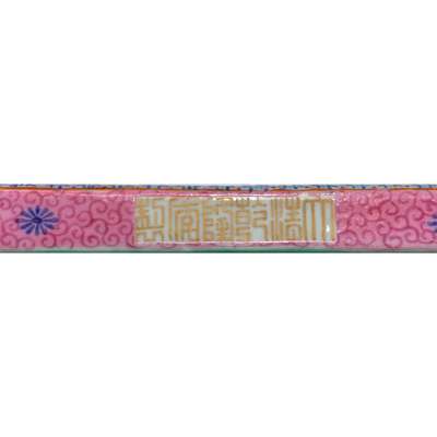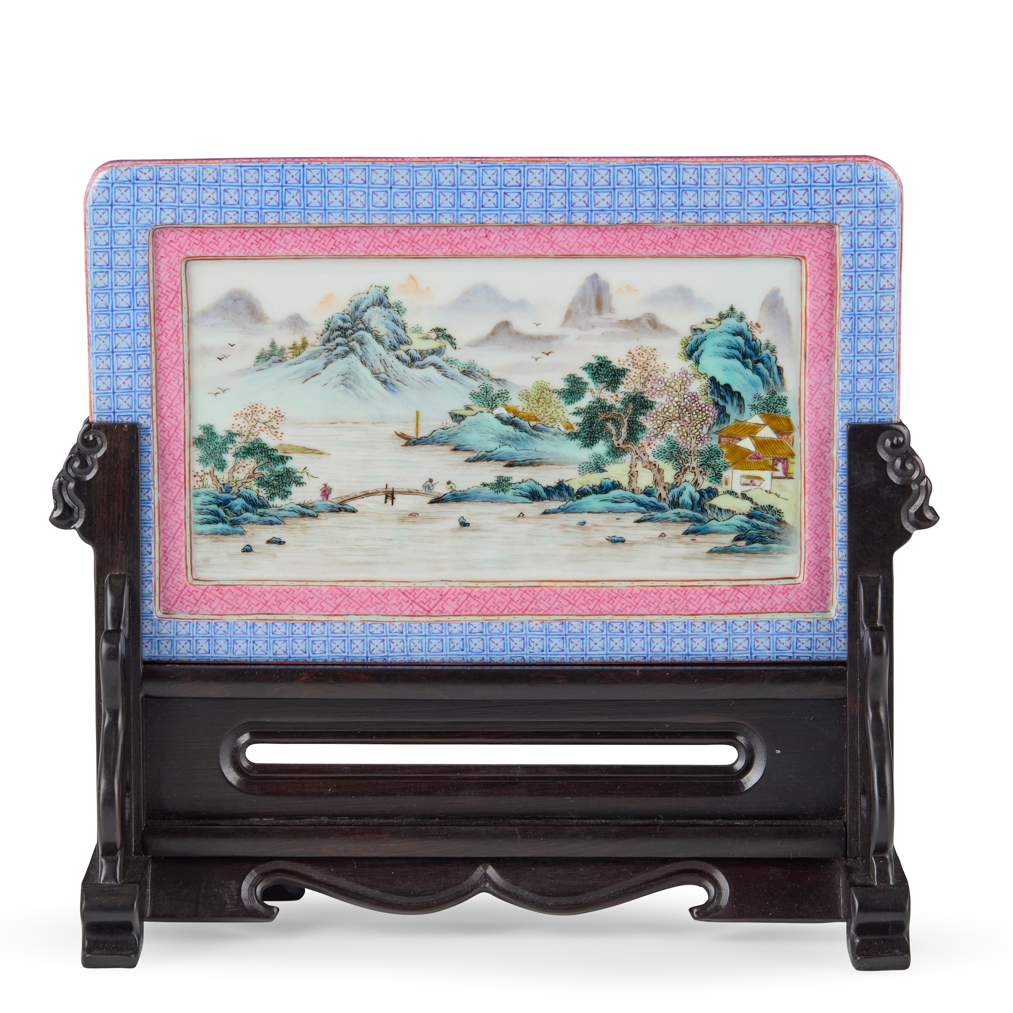 CHINESE FAMILLE ROSE RECTANGULAR PORCELAIN SCREEN WITH WOODEN STAND