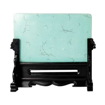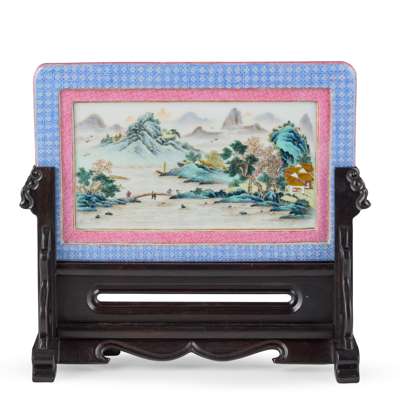 乾隆款 粉彩山水人物紋長方形硯屏 帶木座