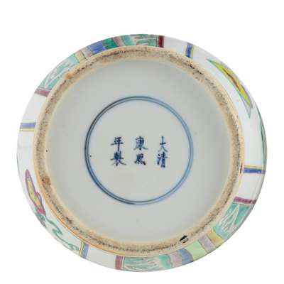each decorated in mirror images with alternative panels of bogu motifs and mythical beasts, the neck with flowers and beribboned auspicious emblems, the base inscribed with a six-character Kangxi mark (2)