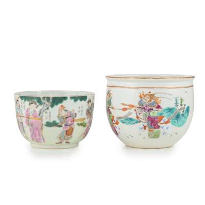 comprising: one small basin painted with warriors, the base inscribed with a six-character Tongzhi mark within two squares; and one deep bowl painted with ‘Wu Shuang Pu’ motif, the base inscribed with a six-character Daoguang mark (2)