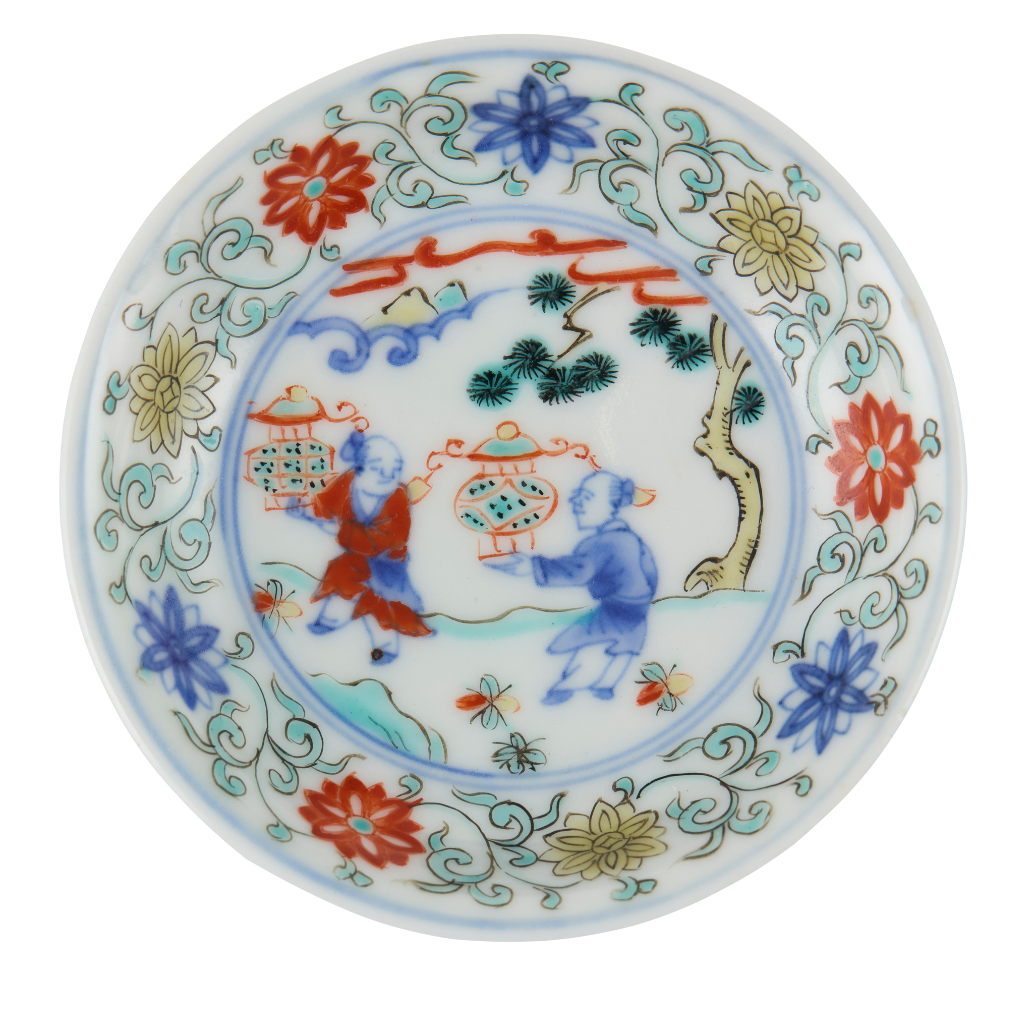 supported on a short foot and terminating into an everted rim, the interior painted with two boys in a garden setting, each holding an elaborate lantern in hands, the cavetto decorated with flowers in tendrils, the exterior painted with four lanterns interspersed with Daoist attributes, the base inscribed with double circles in underglaze blue