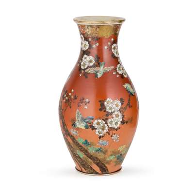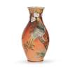 of baluster form, painted with birds and flowers against a burnt orange ground, unmarked
