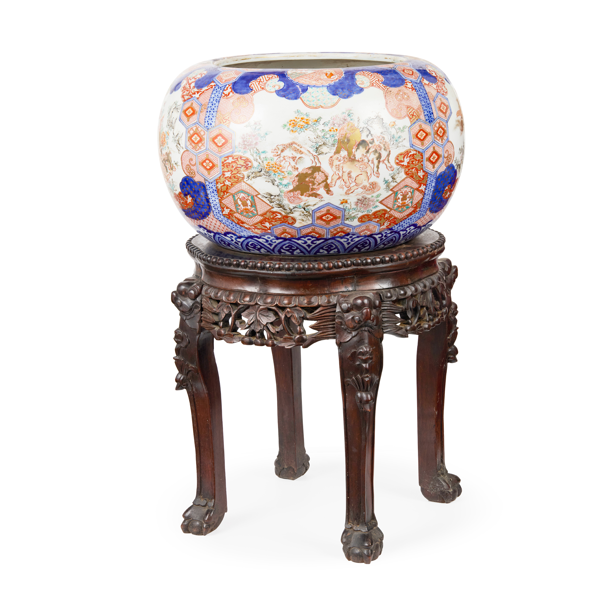 the jardinière of Meiji Period, compressed globular form, painted with mythical beasts and figures in four panels; the stand of Qing dynasty, the lobed rouge marble-inset top above a pierced and carved frieze, raised on carved cabriole legs (2)