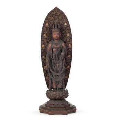 Compare to two large wood figures of Juichi-men Kannon, one very large dated to the Edo or Meiji era, also with with seven siddham character roundels on the nimbus, sold at Bonhams New York, 14 Sep 2016, lot 155; and the other as a zushi (portable shrine), also with the Sanskrit seed syllable kya, dated to the Edo period, 19th century, sold at Bonhams New York, 20 Sep 2023, lot 596.