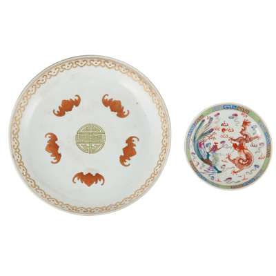 one iron-red with gilt decorated large dish decorated with five bats surrounding a stylised longevity roundel in the centre, the base inscribed with a four-character ‘Shen De Tang Zhi’ mark; the other famille rose dish painted with a dragon and a phoenix amidst ruyi-shaped clouds, the base stamped with a six-character Guangxu mark in red (2)