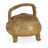 the compressed globular body supported on three short feet, attached with an angled handle in the form of a horned mythical animal cross the shoulder (head missing), the exterior covered in a straw-coloured proto-celadon glaze