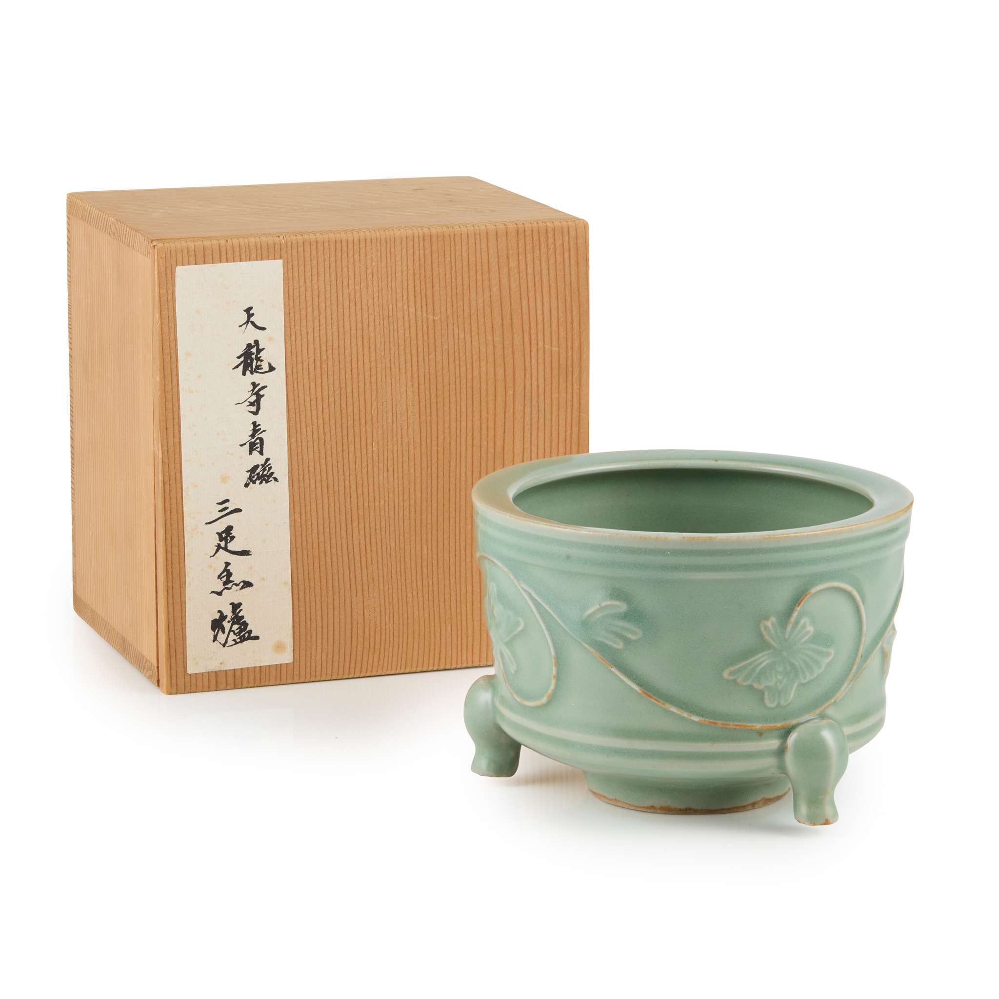 CHINESE CELADON-GLAZED 'PEONY' TRIPOD INCENSE BURNER
