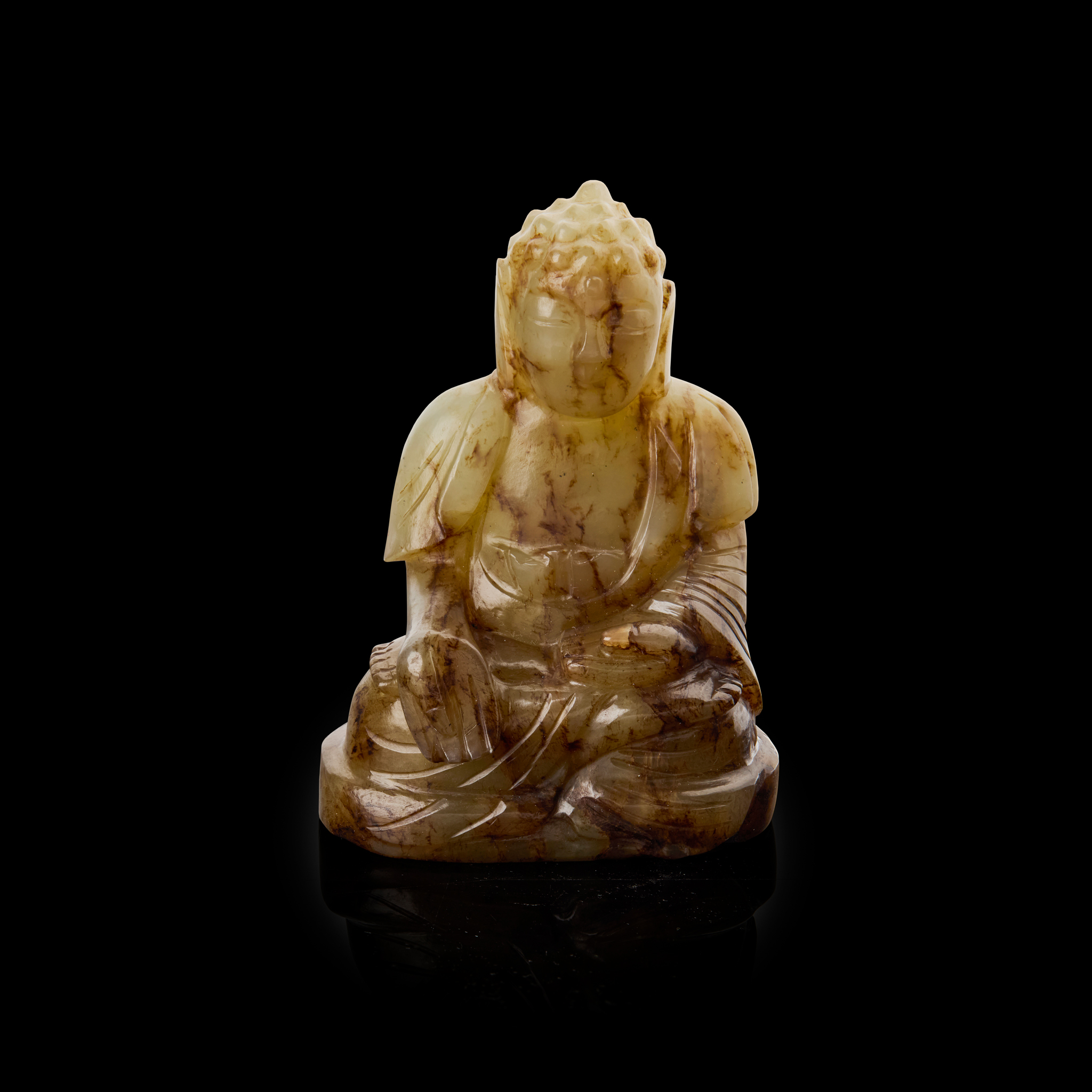depicted seated in vajraparyankasana with the right hand in varada mudra, and the left in dhyanamudra, wearing voluminous robe, the jade of a greyish celadon tone with darker inclusions especially on the lower section