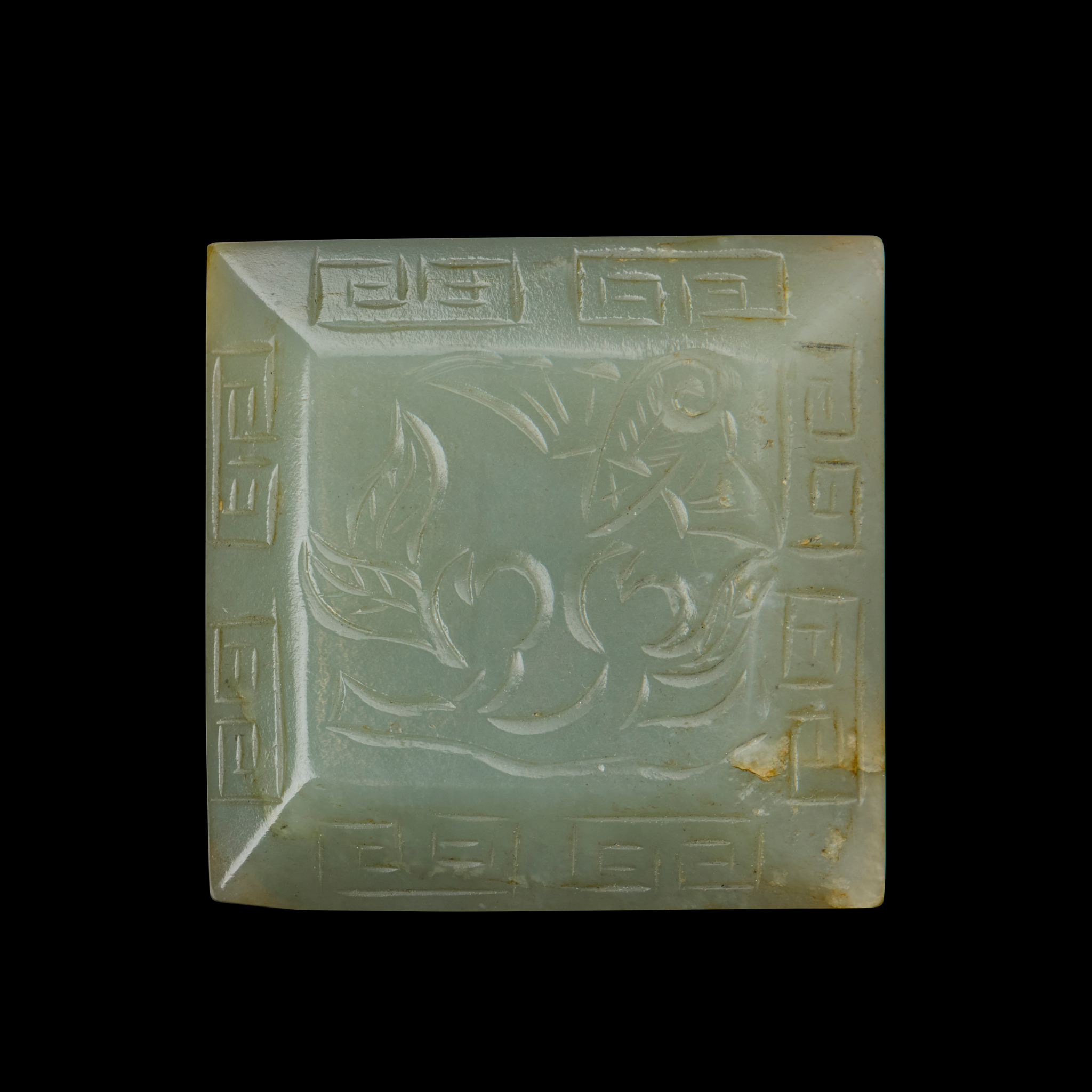 one side carved on the raised surface with a peach tree and a bird, surrounded by a band of key-fred pattern, the reverse incised with a shou longevity sign in between four swirling motifs, the sides with four pairs of drilled holes at each side corner