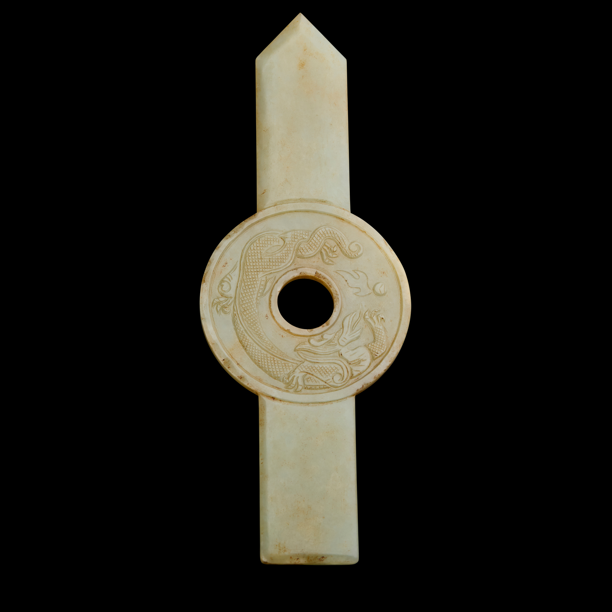 carved on both sides with a pointed tablet gui combined with a circular bi, the later carved with a large scaly dragon chasing a flaming pearl, the stone of white tone with yellowish hue