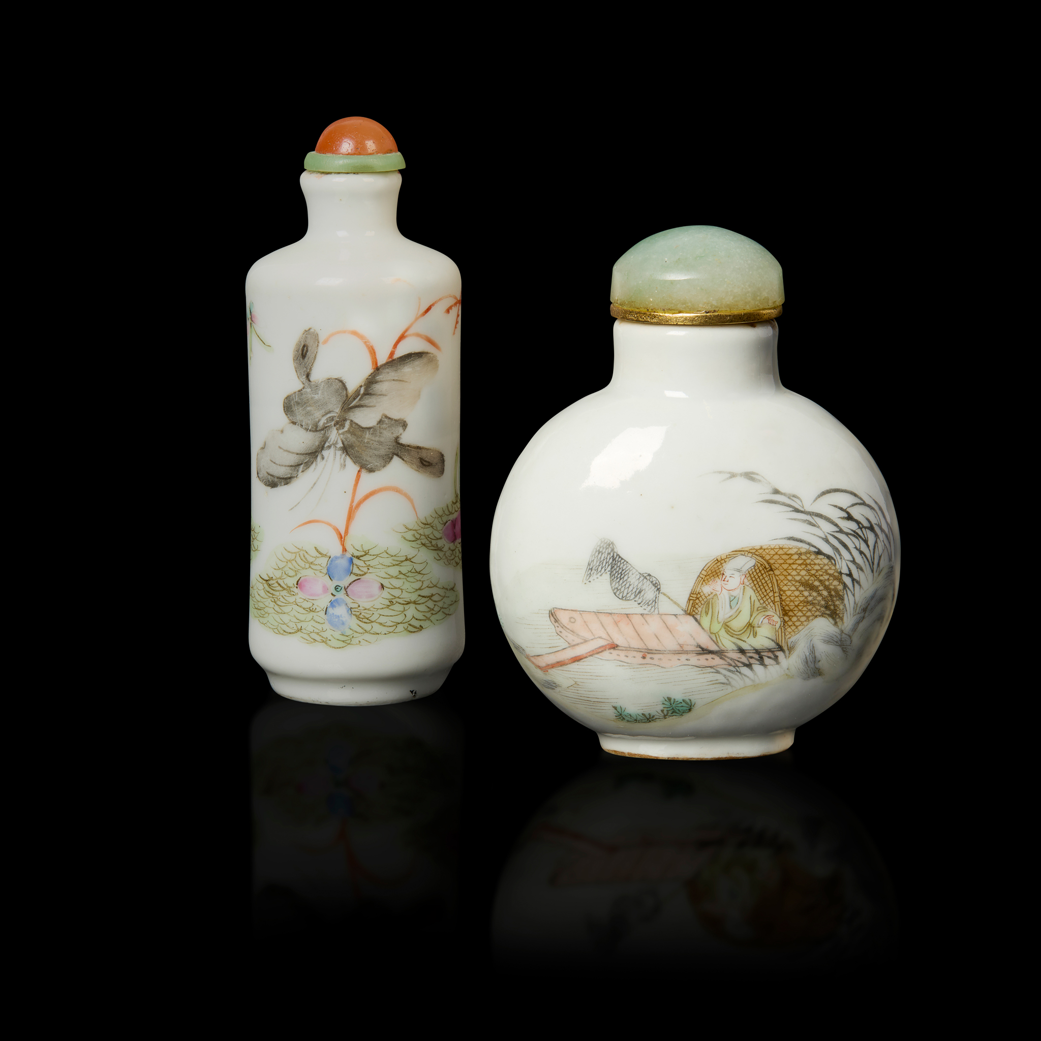 comprising: a flattened bulbous bottle painted with figures on each side, with a green stopper, 6cm high without stopper; and a cylindrical bottle painted with a butterfly with flowers, the base inscribed with an apocryphal Qianlong mark in underglaze blue, with an orange-red stopper, 8cm high without stopper (2)