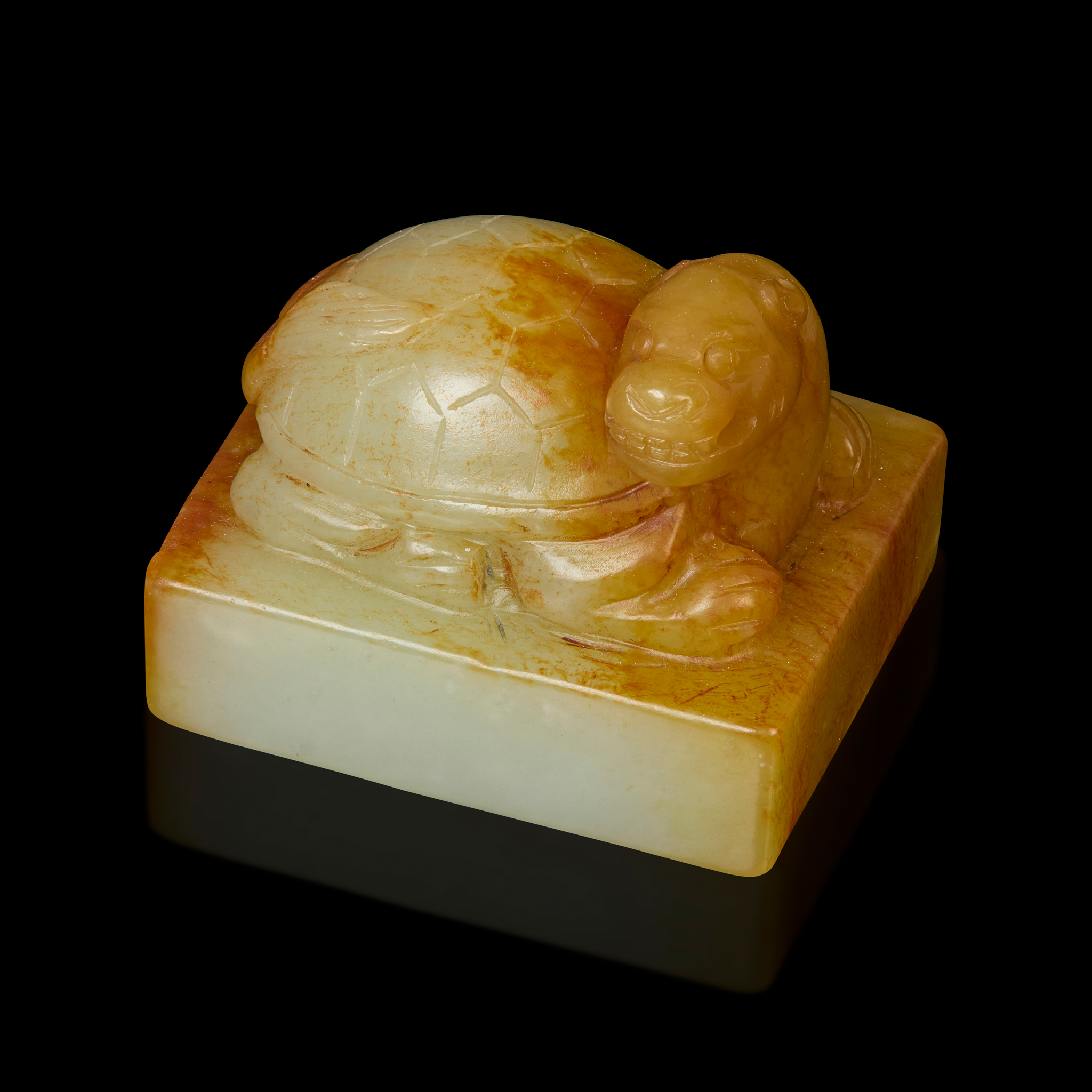 carved with a tortoise finial seated on a rectangular plinth, the seal front carved ‘Su Yanhe yin’, the stone of pale celadon colour with russet inclusions