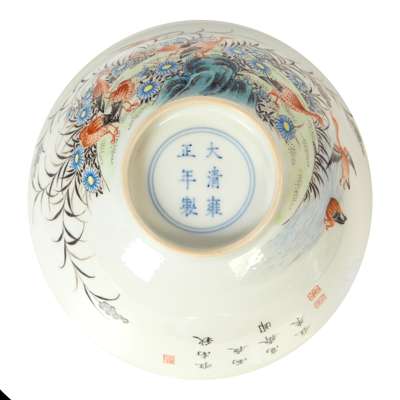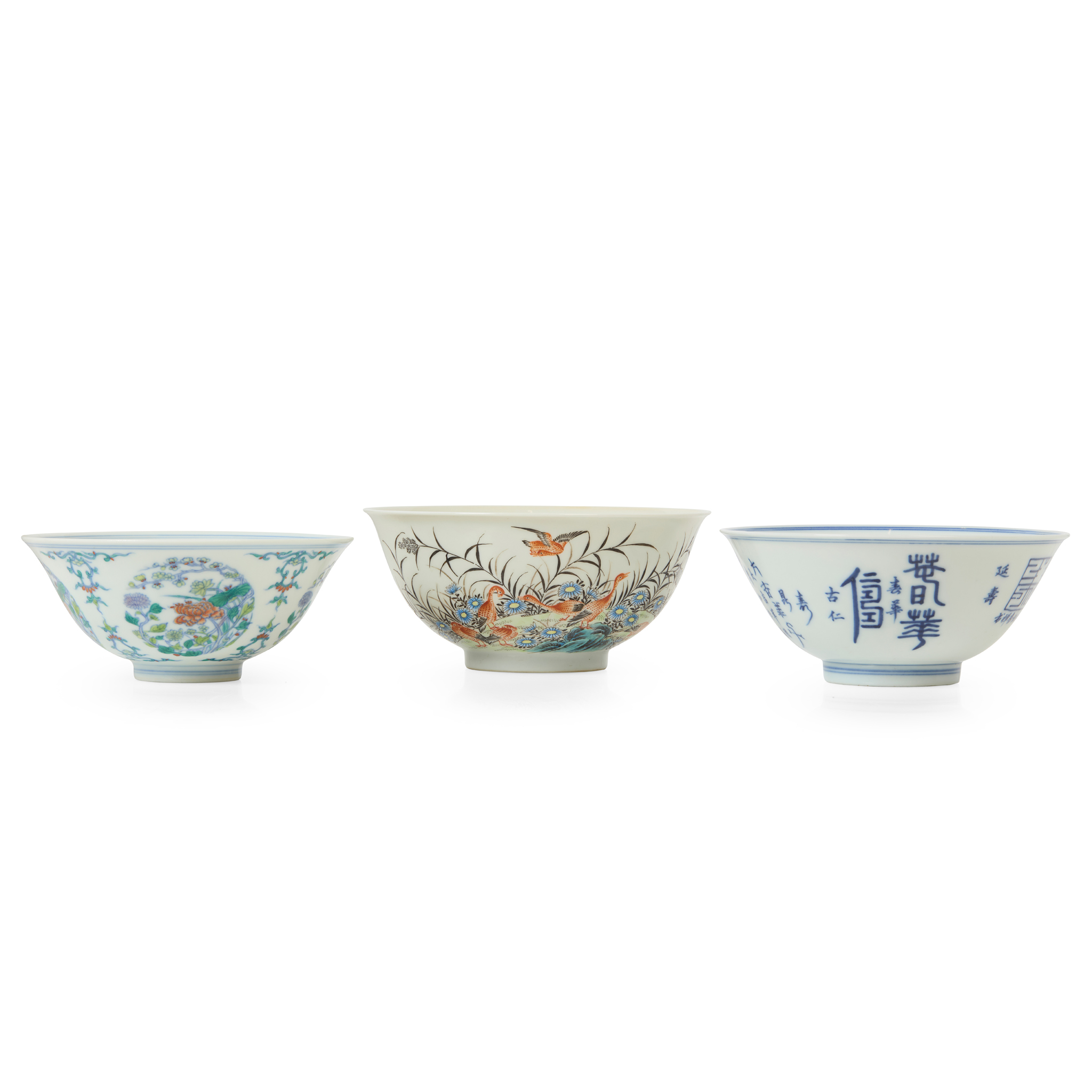 comprising: a famille rose bowl decorated with geese and flowers, reverse with associated poem, the base inscribed with a six-character Yongzheng mark within double-circle in underglaze blue, 15cm diameter; a doucai ‘floral’ bowl, the base inscribed with a six-character Guangxu mark in underglaze blue, 13.5cm diameter; a blue and white ‘inscribed’ bowl, the base inscribed with a six-character Jiangxi Ciye Gongsi mark within double-circle in underglaze blue, 14.4cm diameter (3)