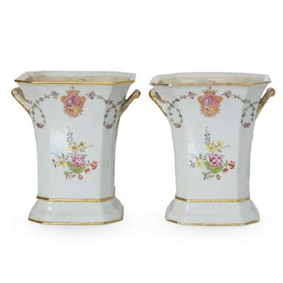 each of waisted square form with canted corners, painted on all sides with floral sprays, the main two sides below the mouth decorated with coat of arms, other two sides set with gilded handles (2)