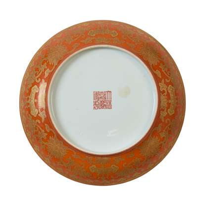 嘉慶款 外珊瑚地描金內粉彩花卉紋盤