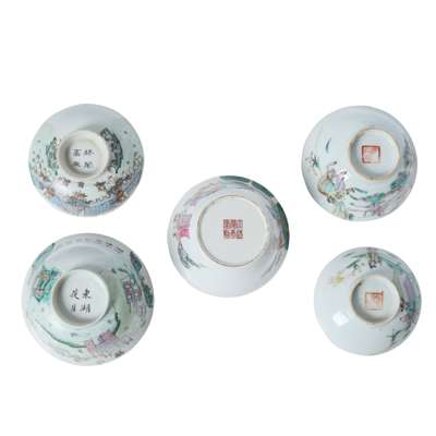 粉彩江西十景東湖夜月茶碗 帶騰閣高風蓋、同治款 粉彩人物紋杯帶蓋、道光款 粉彩八仙紋杯(共五件)
