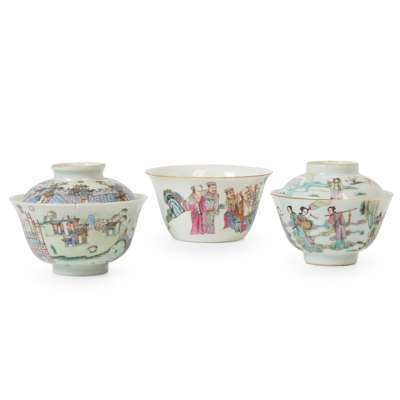 comprising: a cup with Jiangxi Dong Lake scenery with a Jiangxi Pavilion of Prince Teng scenery cover; a ‘figural’ cup with saucer, base of the cup and interior of the finial inscribed with a two-character Tongzhi mark; and an ‘Eight Immortals’ bowl, the base inscribed with a six-character Daoguang mark (5)