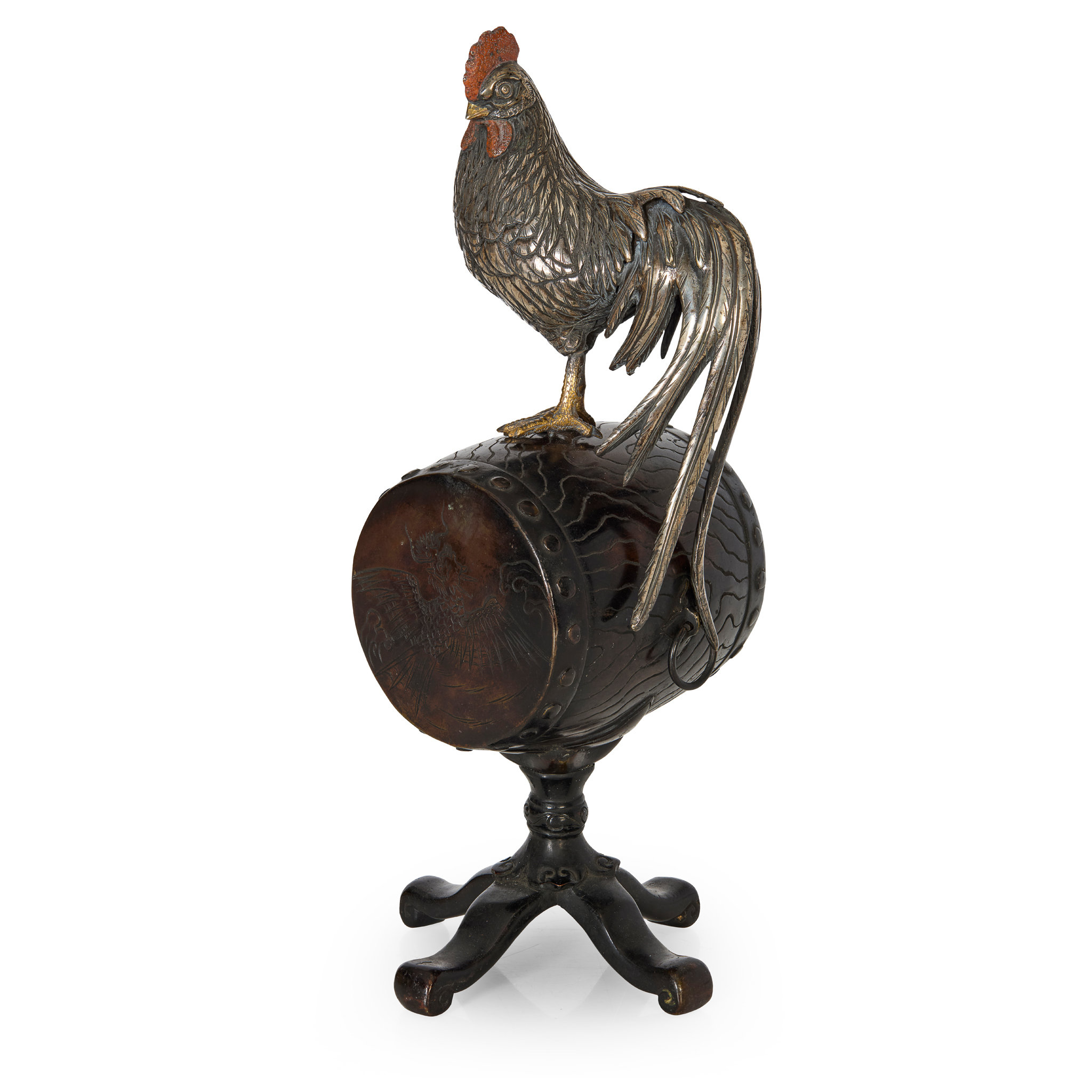 cast in two parts, depicting a rooster perched on a drum supported on a stand