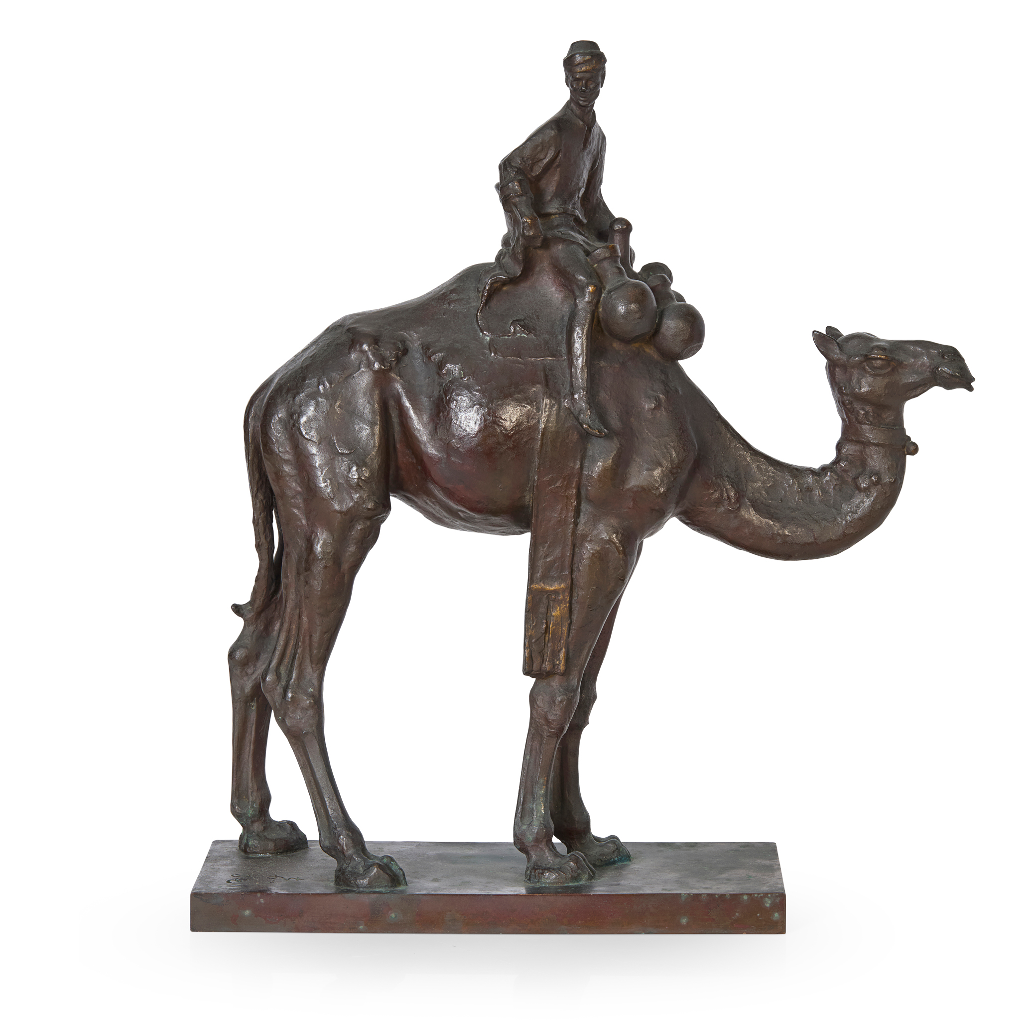 depicts a man riding a camel laden with water bottles, back of the base inscribed with the artist's signature