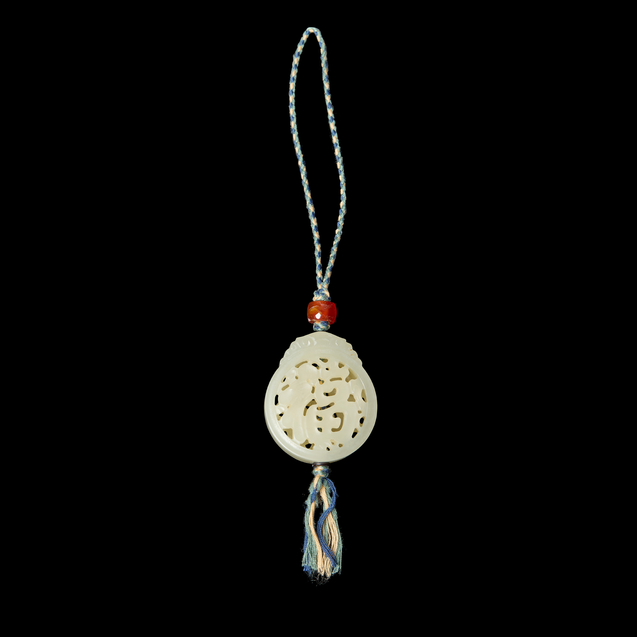 pierced carved in the round on both sides with ‘fu’ character, with an amber bead, the stone of even white colour with a tinge of celadon hue