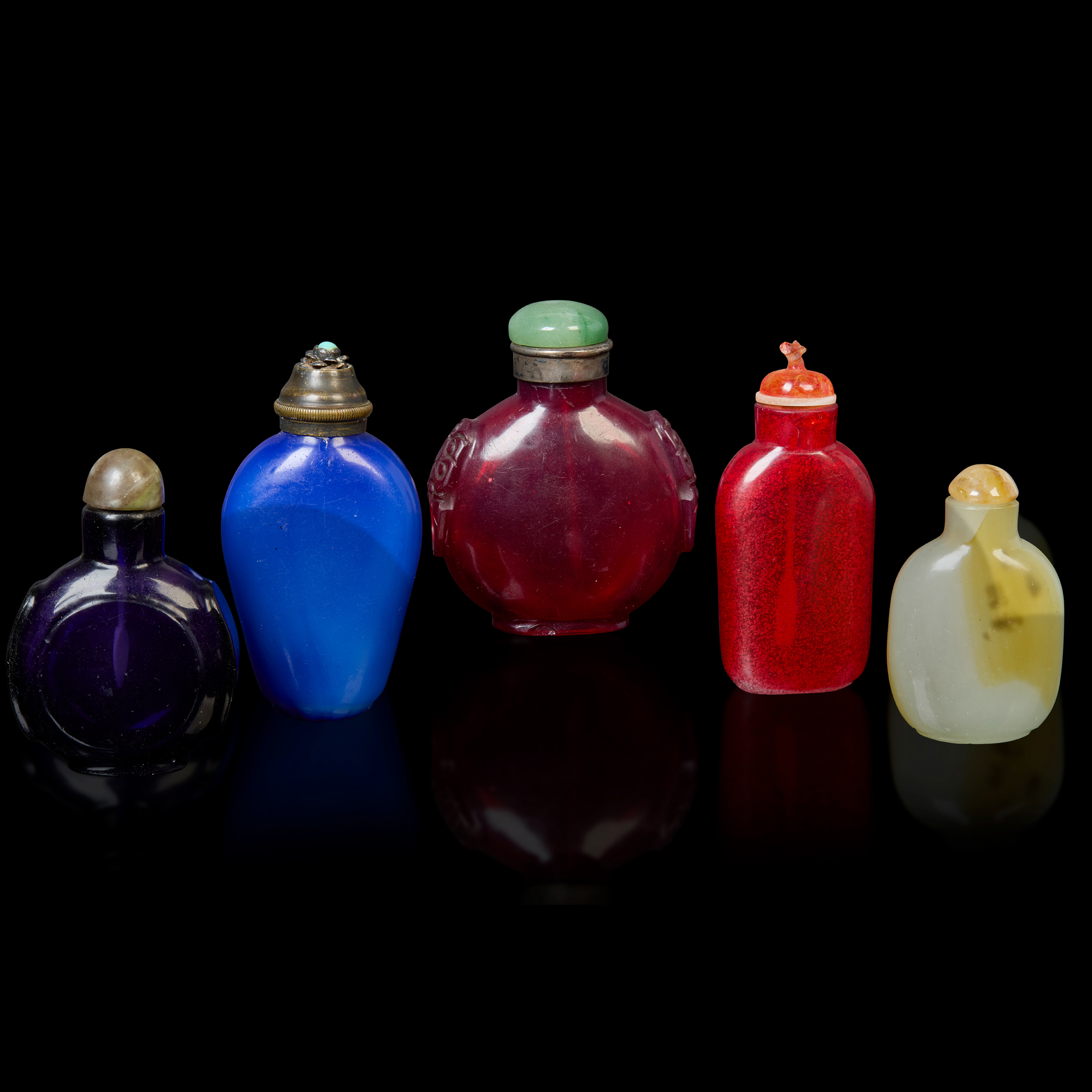 [COLLECTION OF PROF. J. GILBERT & CORA MCALLISTER] GROUP OF FIVE CHINESE GLASS SNUFF BOTTLES