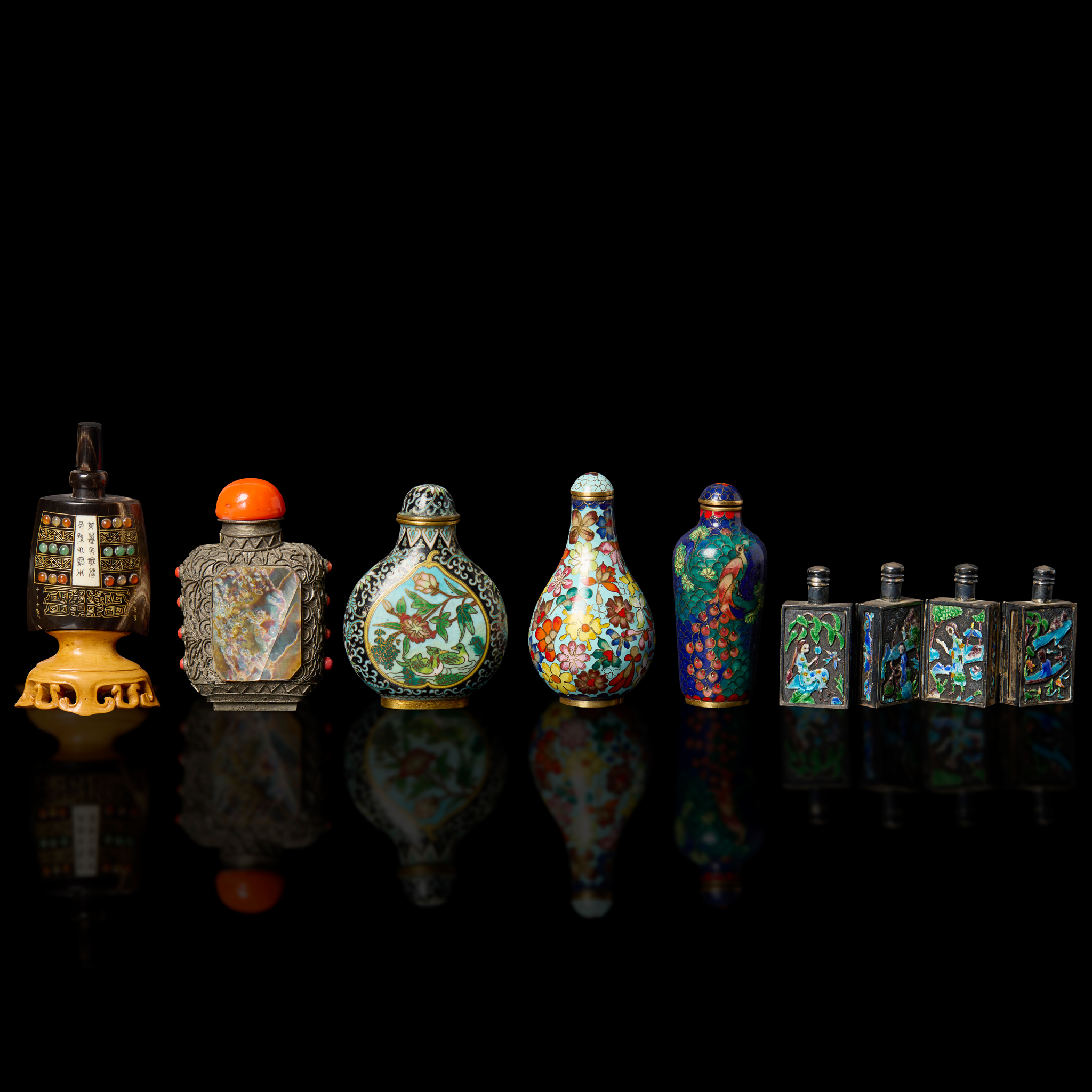 comprising: one cloisonne enamel snuff bottle of flattened form, base with ‘Jing Tai Lan’. 7.5cm high with stopper; one cloisonne enamel of pear from, 8.4cm high with stopper; one cloisonne enamel of cylindrical form, 7.7cm high with stopper; one of archaic bell-form, possibly made of horn, set on wooden stand, 9.2cm high overall; one white metal inlaid with mother-of-pearl and bone plaques, 6cm high without stopper; and one silver of rectangular folding form, one base marked ‘Beijing Cheng Xiang Zu Yin’ in Chinese, 4.5cm high (6)