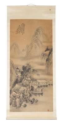 清 賀鑑銓款 山水圖 水墨設色紙本 及 賈山宗款 山水圖 水墨絹本 立軸 (共兩幅)