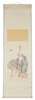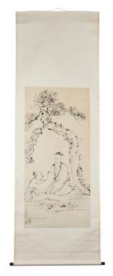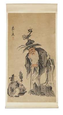 comprising: one ink and colour on paper, depicting two figures and chrysanthemums, signed Su Lanpo, with seals and signature; one ink on paper, depicting two figures and a pine tree, after Gao Qipei, with inscriptions, dated to the Xin Wei Year during Daoguang period; and one ink and colour on woven paper, depicting the God of Longevity, unknown artist, all hanging scrolls (3)